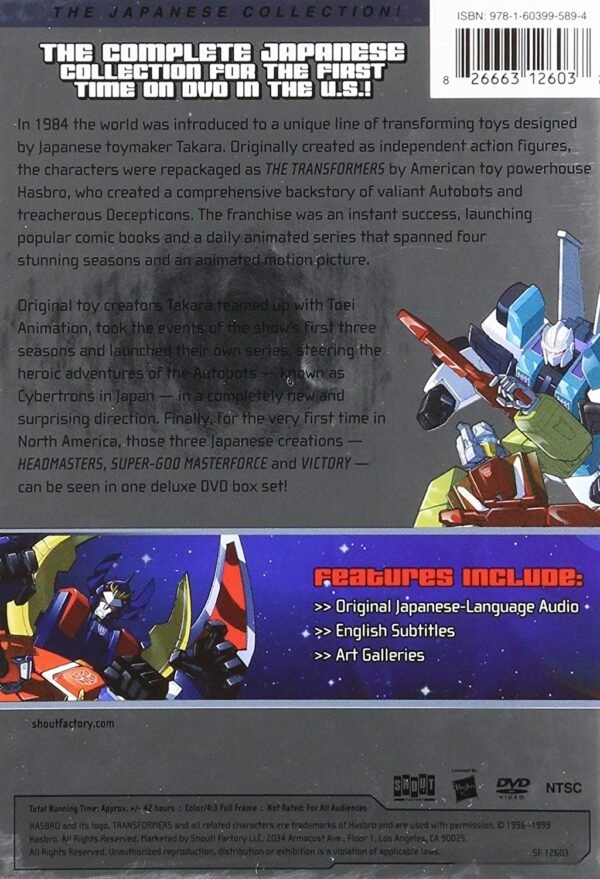 Thirteen-disc set includes: Transformers: Headmasters (1987) Originally airing only in Japan, this exciting animated series picks up where the third season of Transformers leaves off (and disregards the fourth). The battle between the Autobots and Decepticons (here called Cybertrons and Destrons) continues, this time fought by the Headmasters, small robots who join with larger ones to form powerful Transformers. In Japanese with English subtitles. 35 episodes on 4 discs. 13 hrs. CTransformers: Super-God Masterforce (1988)The Autobots and Decepticons wage war once again in this action-packed animated series that was produced for Japanese television. Taking place after quot;Transformers: Headmasters,quot; the show finds human beings merging with the robots in disguise to form the mighty Powermasters. In Japanese with English subtitles. 42 episodes on 5 discs. 15 1/2 hrs. CTransformers: Victory (1989)The third and final chapter in the Japanese-only era of Transformers (following quot;Transformers: Headmastersquot; and quot;Transformers: Super-God Masterforcequot;) finds four new types of robots joining the fray as Autobot commander Star Saber and Decepticon emperor Deszaras lead their forces in a massive battle of epic proportions. In Japanese with English subtitles. 37 episodes on 4 discs. 13 hrs. CStandard; Soundtrack: Japanese; Subtitles: English; commercials; art gallery.